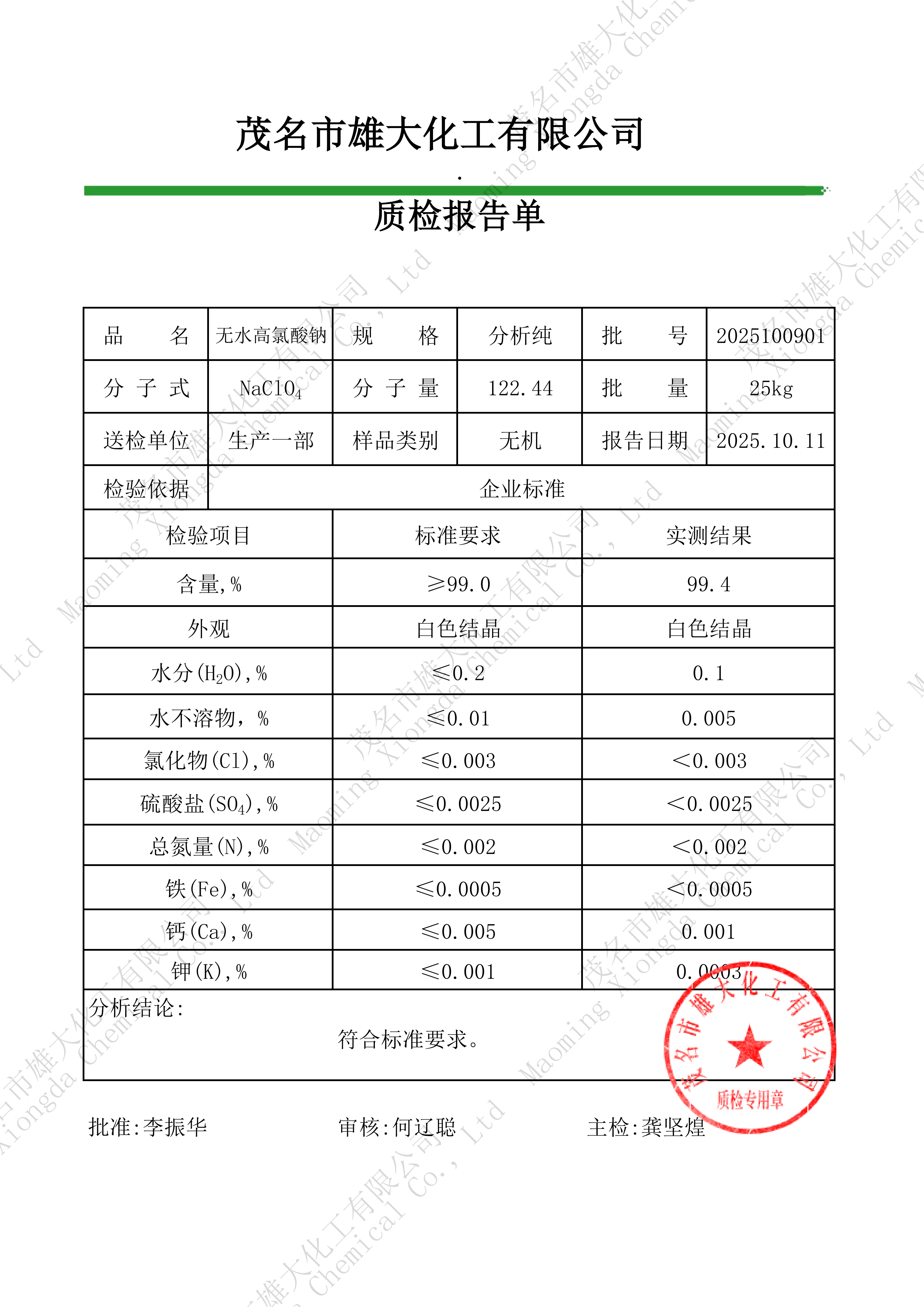 高氯酸钠,是一种无机化合物,化学式为NaClO₄,为白色结晶性粉末,有吸湿性,在482°C时分解,易溶于水,溶于乙醇和丙酮,不溶于乙醚。与有机物摩擦或撞击能引起燃烧或爆炸,接触浓硫酸也能引起爆炸。主要用作制造高氯酸和其他高氯酸盐的原料,也用于制造炸药,用作分析试剂、氧化剂等。